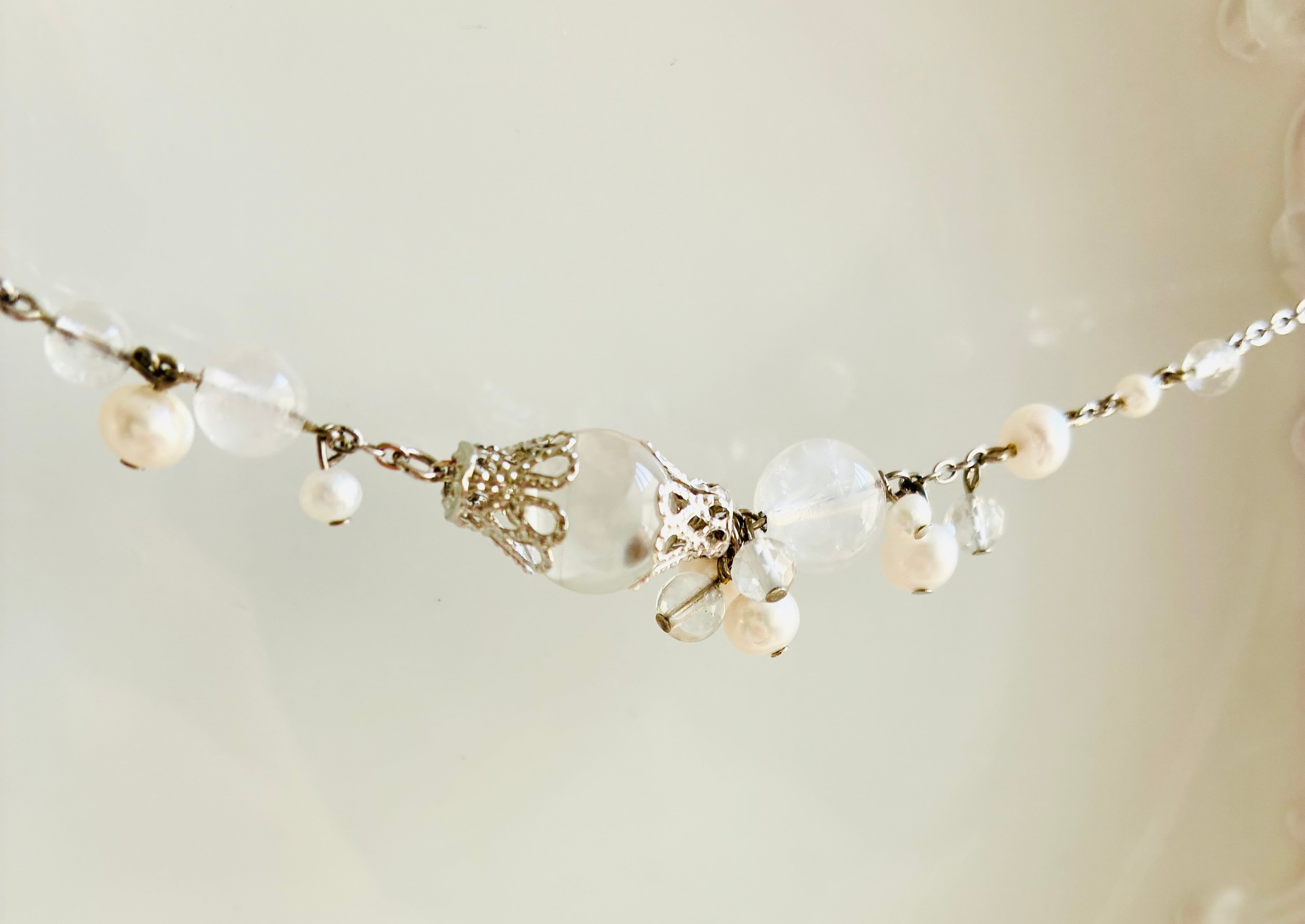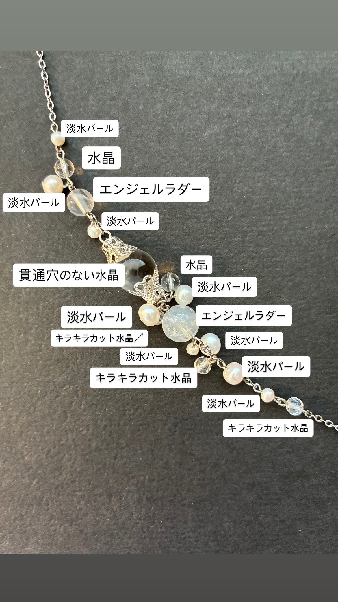 エンジェルラダークォーツ、淡水パール、キラキラカットの水晶など天然石をふんだんに使用したネックレスです。